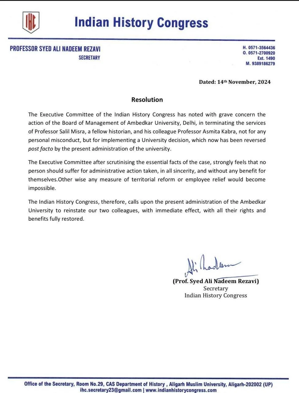 Indian History Congress Resolution Calling for the Reinstatement of Professor Salil Misra and Professor Asmita Kabra Nov 18 Written By Academic Freedom 14 November 2024 | Indian History Congress Academic Freedom