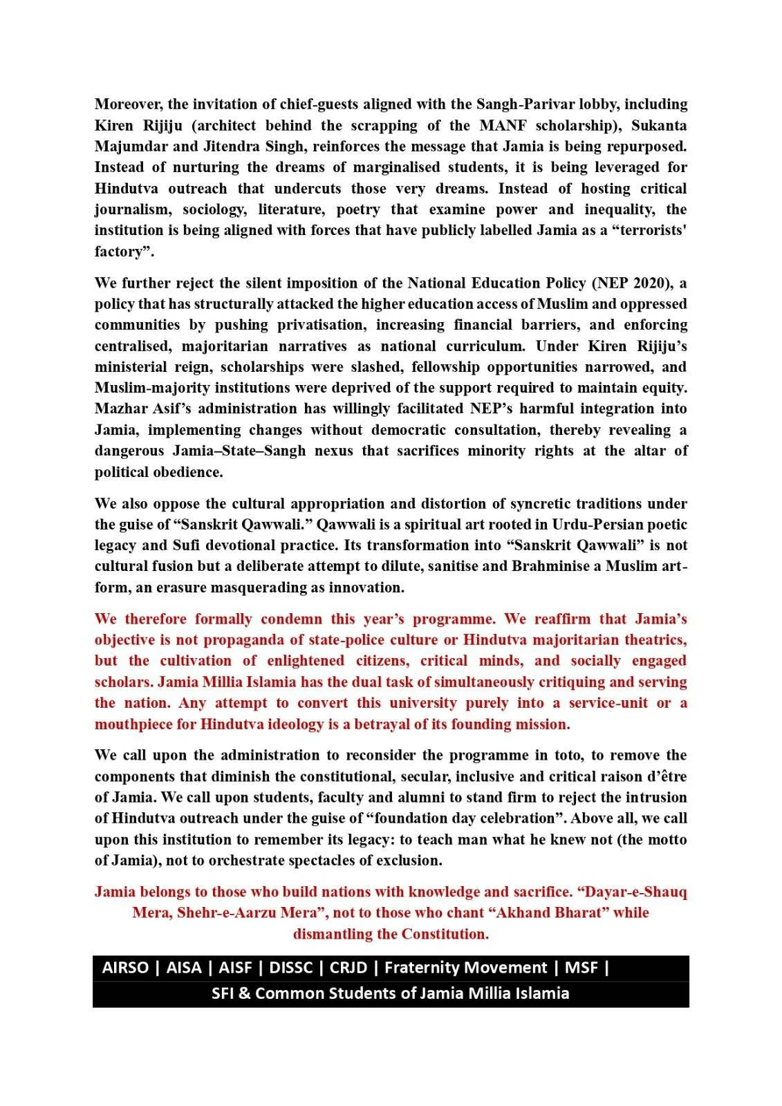 29 October 2025 | AIRSO, AISA, AISF, DISSC, CRJD, Fraternity Movement, MSF, SFI & Common Students of Jamia Millia Islamia