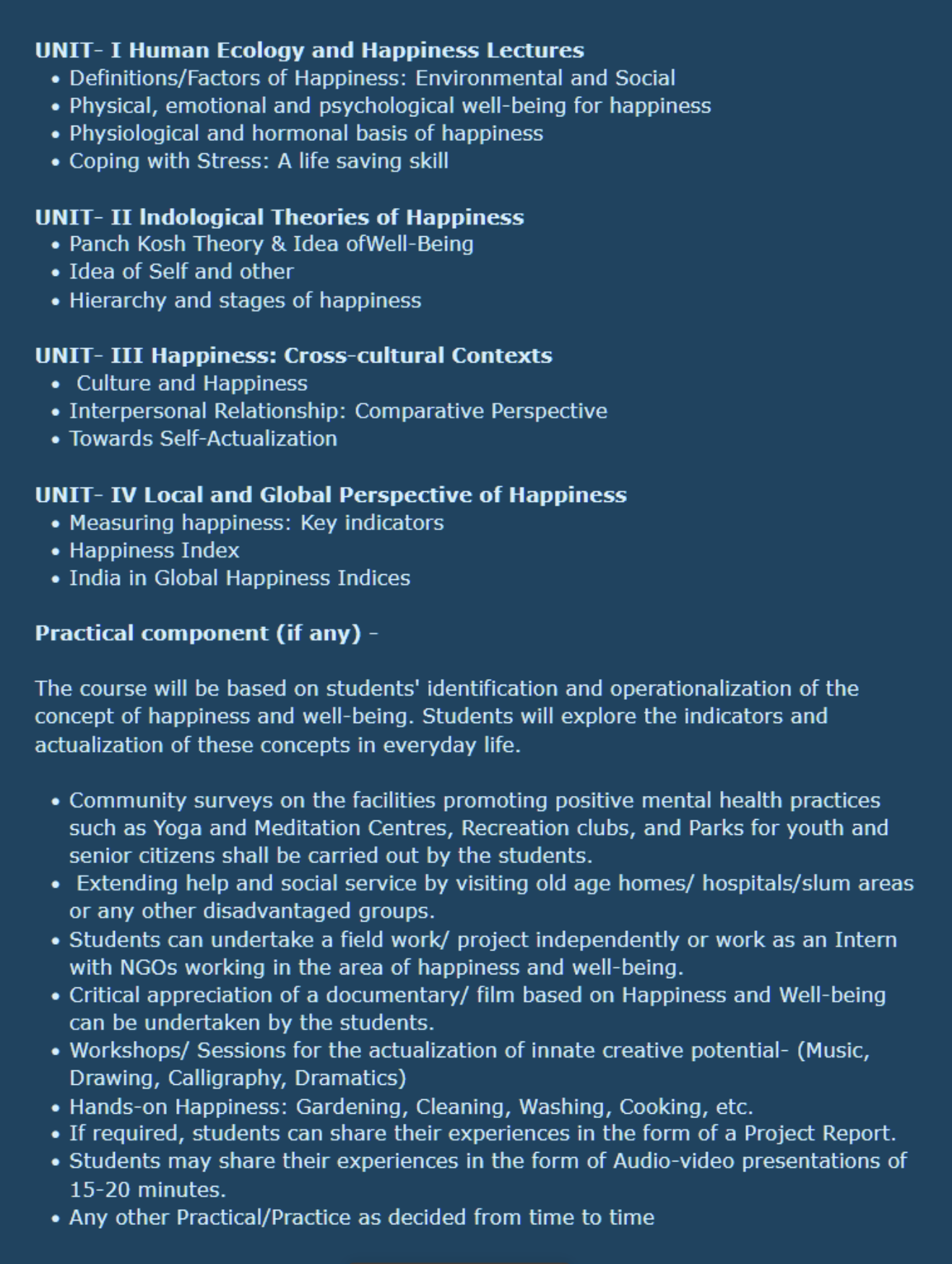 For instance, in a VAC Paper called ‘The Art of Being Happy, we are taught about happiness but never really experience it, for we know that it is only extra weight we have to bear to score in exams. The syllabus is as follows: