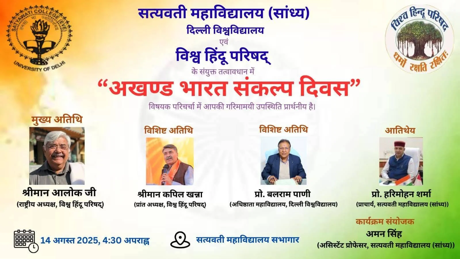 Poster for the Akhand Bharat Sankalp Diwas programme organized by Satyawati College and the Vishva Hindu Parishad. The Chief Guest and other invitees are also affiliated to the VHP.