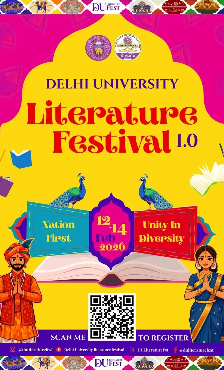 The Delhi University Literature Festival (DULF) 1.0 will be held from 12th to 14th February 2026 at the Rugby Stadium, Multipurpose Hall, and Shankarlal Auditorium, University of Delhi.