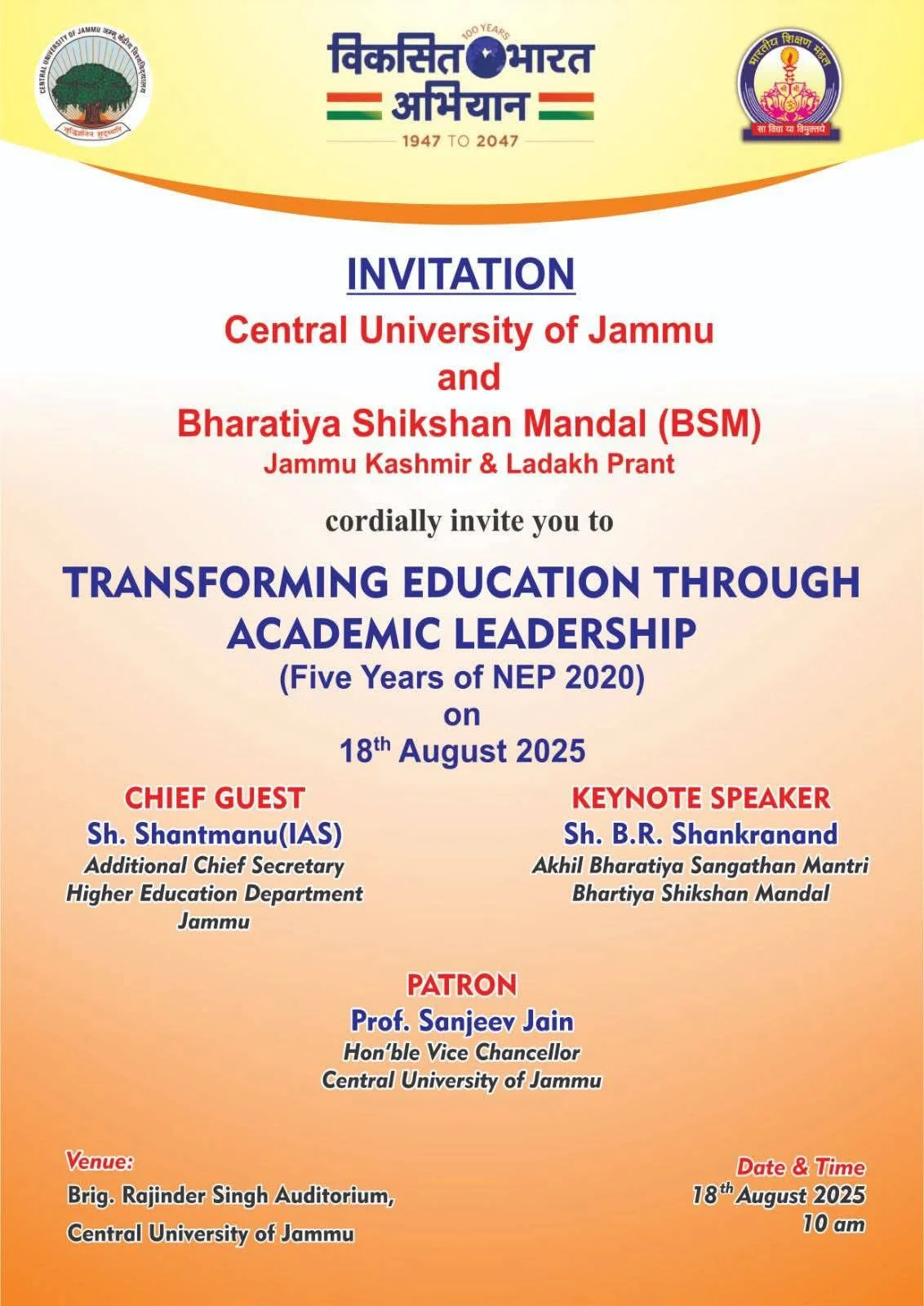 Poster for event on ‘Transforming Education Through Academic Leadership (Five Years of NEP)’ Central University Jammu and Bharatiya Shiksha Mandal (BSM)